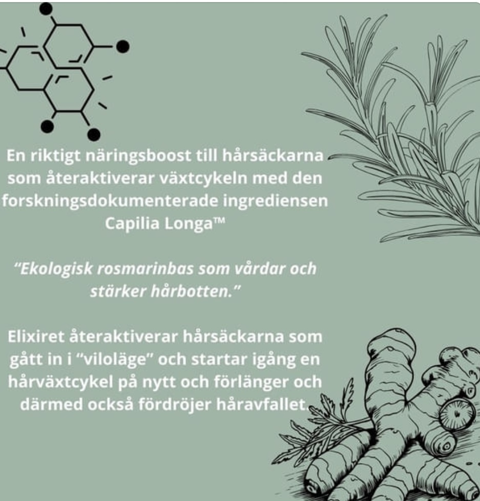 Vårt ekologiska Growth Elixir innehåller det forskningsdokumenterade* Capilia Longa™ tillsammans med den stärkande basen rosmarin. Elixiret återaktiverar hårsäckarna som gått in i “viloläge” och startar igång en hårväxtcykel på nytt och därmed fördröjer håravfallet.