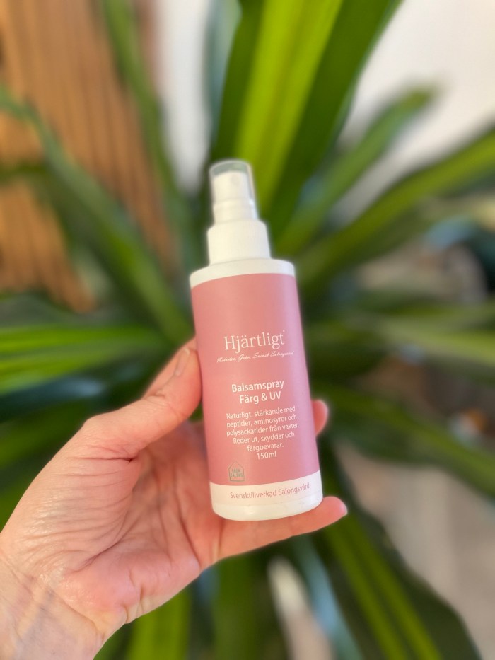 Hjärtligt Balsamspray Färg & UV skyddar och hjälper till att förhindra oxideringen som sker på grund av UV genom att tillföra en hög andel antioxidanter från bland annat kallpressad arganolja som är rik på E-vitamin. Peptiderna i Balsamsprayet går djupt in i stråna och reparerar stråna på djupet.